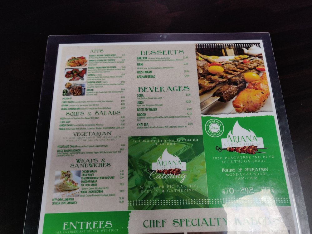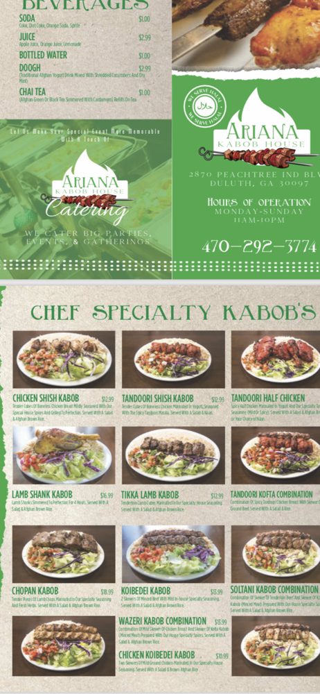 Welcome to ARIANA Kabob House, where the vibrant flavors of Afghan cuisine come to life in Duluth, Georgia. The menu boasts a tantalizing selection of appetizers and mains, each crafted to satisfy cravings. Start your meal with the Nando's Afghan Chicken Wings, marinated in a special sauce and served in a generous ten-piece order. For a heartier option, try the Nando's Afghan Half Chicken or the succulent Whole Nando's Afghan Chicken, paired with fries and salad for a complete feast.